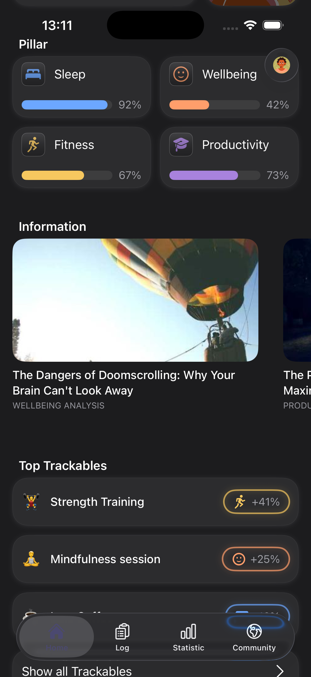 Your VariablesLog the habits and metrics you want to optimize. Use flexible trackables or sync with Apple Health.